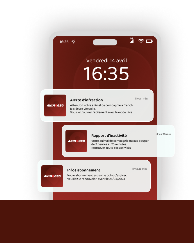 Ne manquez jamais un mouvement important de votre compagnon ! Grâce à Animogeo, recevez instantanément des alertes et notifications sur votre téléphone ou par e-mail dès que votre animal quitte sa zone de sécurité.